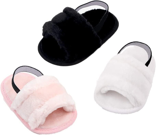 Infant Baby Girls Sandals Faux Fur Slides with Elastic Back Strap Flats Slippers Princess Dress First Walker Moccasins Shoes